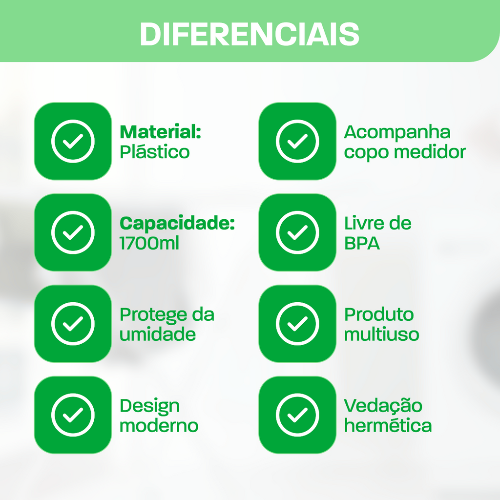 Capacidade: 1700 ml – Perfeito para armazenar grandes quantidades de sabão em pó, mantendo sua lavanderia sempre abastecida.