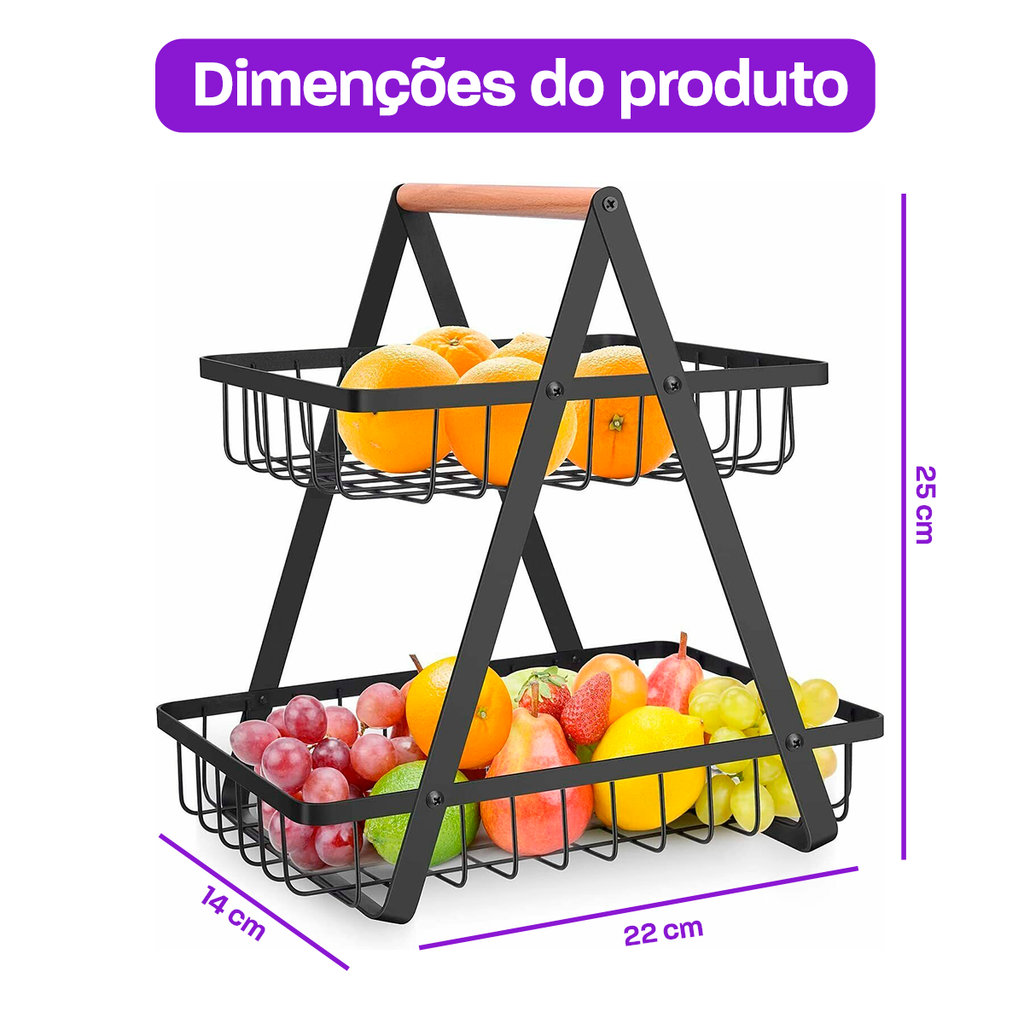 • Otimização do Espaço: Com seu design vertical de dois andares, ela acomoda uma boa quantidade de frutas sem ocupar muito espaço na sua cozinha ou sala de jantar, sendo ideal para ambientes menores.